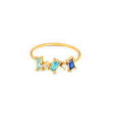 Bague Bleu Céleste brings a refined touch with baguette-cut zirconia stones in radiant shades of blue, set on a slim stainless steel band finished with 18k gold plating. Lightweight and comfortable, it’s designed for everyday elegance.