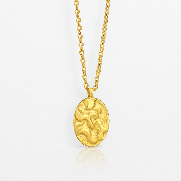 Bold yet refined, L’Ovale Doré is a sculptural necklace that captures the raw elegance of organic texture. The hammered oval pendant reflects light with a warm, golden glow — a subtle statement piece that speaks volumes. Whether worn solo or layered with others, it brings effortless sophistication to your everyday look.