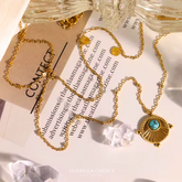 Éclat du Midi Gold Necklace - Embrace the harmony of sophistication and resilience with our enchanting 316L gold-tone layered necklace. The central medallion, a golden disk cradling a serene blue stone, is a tribute to the time-honored eye motif, symbolizing protection and wisdom. The delicate chains, adorned with miniature golden orbs, cascade gracefully, each reflecting a story of strength and continuity. This piece isn't merely an accessory; it's a wearable piece of art that whispers tales of mystery and elegance.